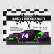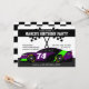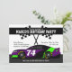Esta invitación de cumpleaños para autos de carrera viene con un cartel que muestra el nombre de la fiesta de cumpleaños. Debajo de la pancarta hay banderas de carreras. Los detalles de la fiesta de cumpleaños están cerca del centro de la invitación encima del auto. La opción de personalizar del número en el lado del coche con una edad, número favorito, etc. está disponible. La información de contacto para RSVP está en la parte inferior.