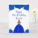 Esta tarjeta de cumpleaños incluye flores florales azules de la purpurina real falsas y una hermosa princesa con el pelo rubio y un vestido elegante. Esto es perfecto para una fiesta de cumpleaños.