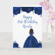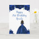 Esta tarjeta de cumpleaños incluye flores florales falsas de color azul marino purpurina y una hermosa princesa con piel oscura y un vestido elegante. Esto es perfecto para una fiesta de cumpleaños.