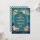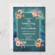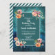 invitación a la fiesta de 16º cumpleaños de color verde verde azulado y azul marino con delicado color rosa y melocotón floral. La parte posterior de esta invitación es un diseño diagonal de rayas verde azuladas y blancas.