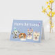 Tarjeta de cumpleaños para los amantes del perro o los niños. Ilustracion de 4 perros (dálmata, beagle, pit bull terrier) con gorras fiestas. Dice "feliz cumpleaños" con fuentes divertidas por encima de las crías. El mensaje que hay dentro dice "Te deseo un cumpleaños laborioso" y es fácilmente editable en línea.