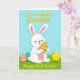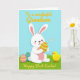 This design shows a white bunny with long ears tipped in soft pink, sitting on fresh green grass and holding a decorated egg close like a treasured gift 🐰. The bunny’s gentle forward gaze and relaxed posture suggest a sweet bond, as if it’s saving the egg for someone special. In its paws, the egg features olive green, sunny yellow, and warm orange patterns that feel festive and carefully painted. Nearby, two more decorated eggs add variety with turquoise, pink, and yellow designs, arranged to frame the bunny like friendly company. On the right side, a small yellow chick with an orange beak looks on with quiet curiosity, adding a cozy, companionable note 🐇. Across the upper area, golden lettering is placed over the sky, sharing a cheerful holiday message and a note about a first celebration. The background fades into a calm sky blue, with a tiny star shape tucked in the upper-right corner.