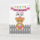 Soft colors and a cuddly plush-style bear stand at the center, shown with rosy cheeks and a pink bow, peeking over a rustic gray picket fence with a gentle, caring posture. The bear cradles a small pink basket filled with pastel eggs patterned in dots and stripes, as if offering a sweet gift to a little one 🐰. Above the scene, a pink banner stretches across the top with the message “HAPPY FIRST EASTER FOR A SWEET Little Girl” in mixed lettering, with the main words larger and the smaller phrase tucked beneath in a lighter, flowing style. The text appears in pink tones that match the bow and basket, keeping the look soft and affectionate. A thin string runs near the top, suspending five decorated eggs that hang like party garlands, adding a friendly, celebratory touch 🌷. The background stays bright white, making the pastel yellows, turquoise, and coral details stand out without feeling busy. Each hanging egg shows its own pattern, and the line of eggs arcs gently above the banner in soft yellow, turquoise, and coral.