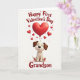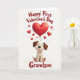This greeting card shows a sweet cartoon puppy sitting on a plain white background, looking completely content with its eyes closed and a big smile 🥰. The puppy has soft cream fur, floppy brown ears, and a simple rounded shape that makes it feel gentle and friendly. Above the puppy floats a large red heart balloon with a shiny look, tied to the puppy by a thin string. Several smaller red heart balloons drift around it, filling the space with a cozy Valentine’s Day feeling ❤️. At the top, the words “Happy First Valentine’s Day” appear in red cursive-style lettering, arched over the balloons. Near the bottom, the word “Grandson” is written in matching red letters, placed below the puppy. The light shading on the hearts and a small shadow under the puppy add depth without distracting from the message. It feels meaningful to give because it pairs a happy little character with a clear message of love for a first Valentine’s Day, making it easy to share Valentine’s Day sentiments.