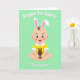 This card shows a stylized baby centered on a smooth mint-green background, smiling with rosy cheeks and wide dark eyes that feel warmly directed at someone special 🌷. The baby wears tall white bunny ears with soft pink inner panels, adding a sweet springtime touch 🐰. A sunny yellow romper with a white rounded collar and rolled cuffs gives the outfit a neat, cuddly look. Small hands hold a dark, bunny-shaped treat close to the chest, like a tiny gift meant to be shared. The illustration uses flat shapes with light shading, keeping the scene simple while still showing gentle depth. White raised-style lettering sits above and below the baby, with soft shadows, and the message includes a “first” milestone plus a short dedication in the same white text. The mint background stays unpatterned, while the pink ear centers and bright yellow outfit stand out clearly against the pastel field.