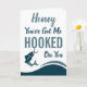 Reel in the love with this funny Hooked on You greeting card for your significant other. Perfect for fishing enthusiasts, this card adds a fun touch to his or her special day. Personalize it with a name or your own fishy message for a unique keepsake. Great for Valentine's day, a wedding anniversary, or just because. Ideal for a boyfriend / husband or a girlfriend / wife who loves to bait some hooks and catch some fish.
