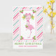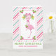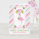 Una tarjeta de felicitación de Navidad tropical caprichosa - estilo de tarjeta doblada. Un fondo a rayas de bastón de caramelo rosa y verde. Superpuesto en la parte superior es un flamenco rosa elegante con una pierna levantada. Con un sombrero de Santa rosa y algunos acebos de temporada. Acebo con bayas también decora las esquinas. Un ramo floral sobre su cabeza con bastones de caramelo cruzados.