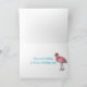 Tu texto de cumpleaños personalizado en la parte delantera y dentro de la tarjeta enmarcada por flamencos y respaldado por un patrón de quatrefoil.