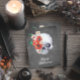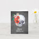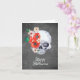 Una tarjeta de Halloween elegantemente espeluznante que presenta una calavera adornada con amapolas rojas, flores suaves y una delicada mariposa sobre un fondo gris texturizado. El texto “Feliz Halloween” añade un toque gótico pero refinado, lo que la hace perfecta para saludos de temporada, cumpleaños de octubre o eventos de inspiración gótica. En blanco por dentro para tu mensaje personal.