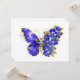 Joyería, azul, zafiro, mariposa floral brillante con ala decorada con flores azules y preciosas con hojas de oro sobre fondo blanco.