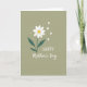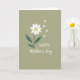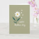 This greeting card features a stylized white flower with softly unfurling petals around a warm golden-yellow center, set against a muted olive-green background. A slender stem drops down into two curved leaves in deep sage green, dotted with lighter speckles that add a natural, lived-in texture. Near the bloom, small white hearts drift upward like a gentle exchange of affection ❤️, as if the flower is quietly sending a loving note into the air. Tiny white dots sprinkled around the design add a light, airy sparkle without crowding the scene. The message sits below the flower, centered near the lower portion of the front, written in flowing handwritten-style lettering. The text is crisp white, standing out clearly against the earthy green backdrop, and it feels like a soft, intimate note between close friends or family 👩. Several small white hearts and delicate white dots float above the flower, while the white message rests beneath it on the olive field.