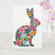 This card shows a right-facing, long-eared rabbit silhouette 🐇 set on a white background, its outline sharp and tidy against the open space. Inside the rabbit shape, a sage-green field holds a dense scatter of flowers and leaves, arranged like a garden tucked into a single figure. Petals in fuchsia, sunny yellow, sky blue, deep violet, and warm orange-red sit close together, with dark green leaves threading between them as if they’re leaning in for a friendly nudge 🌷. Some blossoms have tiny white dots on their petals or contrasting centers, adding little moments that feel like shared glances. Any greeting text would sit best above or below the rabbit in a soft green or charcoal tone so it doesn’t compete with the floral detail. The overall look nods to modern folk-style decoration, with the patterned interior feeling like a bouquet offered without words. The rabbit’s ear and back curve are filled edge to edge with the multicolored blooms and deep green leaves.