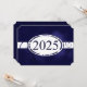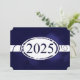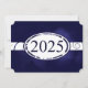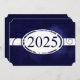 Diseños florales alrededor del botón sobre una cinta blanca que tiene diseños florales. Fondo azul turbio. La parte trasera de la tarjeta tiene un fondo azul con letras blancas para los anuncios de graduación.