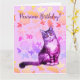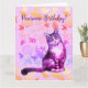 Pintura en acuarela de un gato de pelo largo, flores de fondo, ¡Cumpleaños Pawsome!