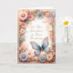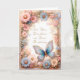 Hermosa mariposa parecida a una joya rodeada de delicadas flores rosadas, duraznos y azules en una tarjeta editable ideal para cumpleaños, agradecimiento, pésame, aniversario, invitación y otras tarjetas de ocasión.