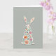 Designed with an upright rabbit centered on a cool gray background, this illustration feels like a decorative emblem meant to be admired up close 🐰. The rabbit’s long ears lift neatly above its head, framing bright blue eyes and a small peach-toned nose that gives it a gentle, friendly look. Its entire silhouette is filled with a dense garden of flowers and leaves, where warm oranges mingle with soft pinks and deeper crimson blooms. Green foliage and curling stems weave everything together, creating the look of two floral paths meeting and intertwining like a quiet sign of affection. A soft drop shadow behind the rabbit adds depth, as if the figure is slightly raised from the page. Any greeting text can sit above the rabbit in a simple dark gray, with a smaller line below in muted green, leaving the artwork as the main focus 🌷. The petals show fine linework and shading, and the leafy stems curl around the belly and legs in looping, lace-like patterns.