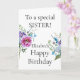 Flores azules púrpura claras y finas tarjetas de hermana de cumpleaños feliz.