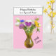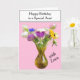 Feliz cumpleaños a una tía especial está escrito en tipografía negra contra fondo geométrico blanco y gris. Inserta para mamá, abuela, etc. Bonito de flores en jarrón de vidrio amarillo rosa, azul, violeta, blanco y amarillo con fondo blanco. Deja el versículo de la tarjeta, o inserta con tu propio. Globos de corazón coloridos dentro de la derecha. Bandas verticales de color pastel de acuarela en la parte posterior en color violeta, rosa, melocotón y amarillo. Fotografía original y diseño de obras de arte © TamiraZDesigns.