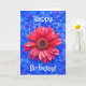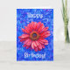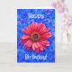 Mi obra de arte digital original con mi fotografía original de una flor de margarita de Gerbera roja aparece en esta tarjeta de cumpleaños floral de bonito. La imagen fue procesada con un efecto de fantasía acuarela para una apariencia ilustrada y caprichosa con mareas azules en el fondo. La parte delantera de la tarjeta dice "¡Feliz cumpleaños!" y el interior de la tarjeta dice "¡Espero que este día florezca con mucha felicidad!". Una gran carta para cualquier amante de la naturaleza y de las flores.