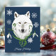 Un lobo ártico blanco con flores de nevada de estilo Art Nouveau. Un fondo azul oscuro y copos de nieve detrás y alrededor del lobo ártico.