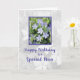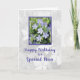 Tarjeta Flores moradas de cumpleaños con hojas verdes