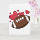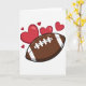This card features a caramel-brown American football angled across a bright white background, with white laces and stripes drawn in sharp detail. Around it, glossy red hearts float at different sizes, some tucked behind the ball and others drifting near the edges like they’re circling close. The hearts have smooth curves and tiny highlights that make them look shiny, adding a sweet, affectionate tone 🥰. The strong contrast between the red hearts, brown football, and white backdrop keeps everything easy to spot at a glance. Any text would sit neatly above or below the football in red to match the hearts, standing out clearly against the white space. The overall layout feels like a flirty nod to game-day excitement, as if someone’s heart is right there on the field ❤️. Small hearts are scattered near the corners while a few larger ones cluster behind the football for depth.