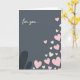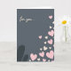 This design shows a deep slate-gray background with the phrase “for you..” placed in the upper left in a soft ivory color, like a gentle note meant for someone close 🥰. Along the right side and curling into the lower edge, a trail of heart shapes drifts downward in pastel pink and creamy beige, suggesting a quiet exchange of affection ❤️. Each heart has a faint shadow that makes it look slightly raised, as if it were carefully set on the surface. The spacing and mix of sizes feel naturally scattered, like little tokens dropped one by one as the eye travels across the card. The lighting stays even and calm, helping the hearts’ edges and shadows stand out against the dark background. In the bottom left corner, a dark, organic shape appears—almost like the tip of a rabbit ear or a soft leaf—adding a small, mysterious accent. The hearts cluster most densely near the right edge and lower border, with a few hovering closer to the center for balance.