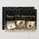 Elegante diseño de tarjetas de aniversario de bodas personalizadas con confeti de oro y plata brillantes sobre fondo negro, tipografía de escritura moderna con las palabras "Feliz 50 aniversario" y tres de tus fotos favoritas enmarcadas en Relieve metalizado de oro metálico en la parte delantera de la tarjeta junto con tu mensaje y cerrando en la parte trasera.
