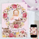 Tarjeta de cumpleaños de bonito para una niña especial con sus mensajes de foto y personalizado dentro. El diseño presenta una corona floral de bonito y un borde a juego con rosas en flor, flores delicadas y ciervos de bosque. Dentro de la muestra, la redacción es totalmente editable y actualmente dice "hip hip hip hop [name is age] hoy .. ten un mágico cumpleaños lleno de diversión y sorpresas", que puedes personalizar como quieras.