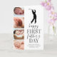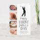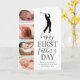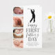 Tarjeta del Día del Padre para nuevo papá linda que presenta un fondo blanco simplista que se puede cambiar a cualquier color, un collage de 4 fotos de tu bebé, una silueta de golfista, el dicho "feliz primer día del padre", y una leyenda de papá que se personaliza fácilmente.