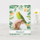 Cuando alguien adopta un pájaro mascota de un refugio, esta tarjeta será un recuerdo. Añade una foto del pájaro, o de la persona con pájaro y agrega texto personalizado como la especie de ave o su nombre, mientras los felicitas por su adopción de pájaro. Las hojas y flores del bosque tropical le dan un toque verde. El interior siempre es editable.