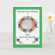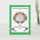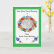 Una tarjeta de fotos con un borde verde y un 'marco' floral ovalado para tu foto, mucho espacio para tus propios saludos, tanto dentro como en la portada. De un collage de papel pintado a mano por Judy Adamson.
