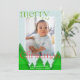 Sencilla tarjeta de Navidades moderna con una sola foto enmarcada en un borde blanco sobre un fondo azul pálido de hielo. Un bosque de árboles geométricos con tonos verdes mezclados aporta un detalle único. Una brillante "feliz Navidad" verde y rojo en un tipográfico con algunas florituras festivas. Personaliza con un breve mensaje y tus nombres, y el año. La parte posterior de la tarjeta presenta un patrón de árbol en una combinación de colores coincidente.