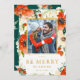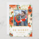 Tarjeta fotográfica navideña con flores rojas y Relieve metalizado de oro falso. Flores color de agua rojo y crema y botánicos verdes enmarcan tu foto con "Be Merry" debajo en oro con el nombre y el año.