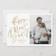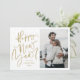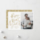 ¡Desee a sus seres queridos un feliz año nuevo al estilo con nuestra moderna tarjeta de fotos de Año Nuevo con letras de oro para las vacaciones de Año Nuevo! La tarjeta fotográfica de feriado de moda incluye "Feliz Año Nuevo" en un guión dorado con letras a mano. Personalice la tarjeta agregando su nombre, el año y su foto favorita. La carta se revierte a un patrón de copos de nieve de starburst dorados y blancos.