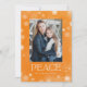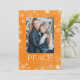 Impresione a todos en su lista de tarjetas de Navidades con una elegante tarjeta fotográfica de vacaciones con copos de nieve. La única tarjeta de vacaciones muestra tu foto familiar favorita en la parte delantera con copos de nieve blancos en el borde contra un fondo acuático naranja. "Paz" aparece en un moderno y moderno tipo de letra serif con tu nombre o texto personalizado que se muestra a continuación. La parte posterior de la tarjeta de vacaciones de copo de nieve incluye una foto adicional con el mensaje de su personalizado en texto blanco contra un fondo de acuarela naranja. El diseño se coordina con nuestra colección de tarjetas de Navidades de la Paz Escarcha.
