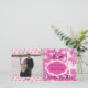 Difunde tu alegría navideña a amigos y familia empezando con esta original y caprichosa tarjeta de fotos de las fiestas de Snowflakes y Navidades de renos con un fondo rosa con copos de nieve blancos y texto que lee Feliz Navidad, estrellas rosas, un reno blanco de silueta con corderos decorados con adornos, adornos navideños y áreas donde puedes agregar tus nombres, apellidos, el año actual, y tu foto!