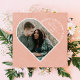 Un marco fotográfico de arco y un diseño tipográfico audaz trabajan juntos para crear esta tarjeta de saludo El día de San Valentín moderna en forma de corazón. La parte posterior de la tarjeta presenta un patrón cardíaco simple pero festivo.