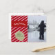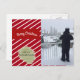 Un diseño festivo con un fondo de rayas diagonales rojas y blancas. Feliz Navidad con una fuente alegre y blanca y una muestra dorada de color acentúa los nombres. Añade la imagen y el personalizar que desee.