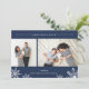 La elegante y moderna tarjeta de fotos de Hanukkah presenta dos fotos favoritas alineadas una al lado de la otra, con "Joyous Hanukkah" en la parte superior en itálico blanco y tipografía en bloques. Personalice el saludo de su personalizado y su nombre en la parte inferior, acentuado por cuatro ilustraciones blancos de copos de nieve. Un fondo azul marino añade elegancia clásica a tu bienvenida vacacional. La tarjeta se revierte a un patrón de nevada en gris moda.
