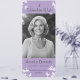 Una elegante carta de la Celebración de la Vida adornada con delicadas flores silvestres blancas contra un suave y sereno telón de fondo morado. Un bello y significativo tributo al honor y al cariño de la memoria de un ser querido.