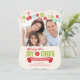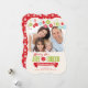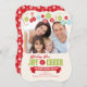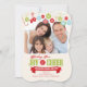Cuta tarjeta de navidades familiares con latas de caramelo, mitones, ornamentos retro con la festividad que dice "Te deseo alegría y alegría" en tipografía roja y verde. Voltea nuestra tarjeta de foto para ver un adorno rojo coordinado de vuelta para un toque especial extra. Disponible en una forma de corte de soporte moderno.