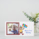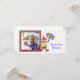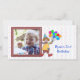 Una bonita tarjeta de fotos de cumpleaños con un payaso con un ramo de globo y un colorido fondo de confeti con marco rojo para tu foto.
