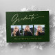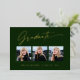 Tres fotos, impresionantes, modernas y elegantes tarjetas de Relieve metalizado oro de invitación de graduación (tu elección de Relieve metalizado de oro plateado o rosa), con elementos de diseño de texto moderno con escritura de tinta caligráfica. Las fotos de los graduados se acentúan artísticamente con una frontera parcial delicada y minimalista. La parte posterior de la tarjeta ofrece espacios de texto personalizados para obtener información sobre su graduación o puede ser borrado si desea escribir un mensaje a mano. Selva esmeralda verde o personalizar fácilmente el fondo para que coincida con el color primario de su escuela o cualquier color de su elección. Perfecto para estudiantes de secundaria, universitarios y universitarios.