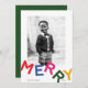 Sumérjase en un mundo de encanto minimalista y alegría vibrante con este encantador diseño de tarjetas de vacaciones. Con un fondo blanco y limpio, la foto de tu personalizado brilla al frente, capturando un momento apreciado que encarna el espíritu de la temporada. Grandes letras mayúsculas, lúgubres y atrevidas forman la palabra "MERRY" debajo de la foto. Cada letra está infundida con un color brillante diferente, creando una exhibición visualmente llamativa que irradia con alegría festiva. Las coloridas cartas bailan alegremente, invitando a los destinatarios a abrazar la alegría y la emoción de la temporada navideña. Debajo de la foto, en una fuente clásica y elegante sans serif, el nombre de tu familia y el año se muestran elegantemente en negro. Este toque sutil añade un toque personal y atemporal al diseño, haciendo de esta carta un regalo muy preciado.