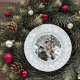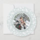 Elegante tarjeta fotográfica de vacaciones en una forma redonda única presenta una foto favorita rodeada por una corona de follaje blanco de invierno sobre un fondo azul-verde pálido y helado. Personaliza con un saludo de vacaciones personalizado (mostrado con "ten un Navidad alegre"), tus nombres o apellido, y el año con letras grises de moda.