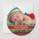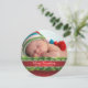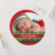Tarjeta fotográfica de Navidad circular con ramas verdes de pino con encaje y cinta roja.