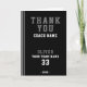 Gracias Coach Football Player Team Card Card. Añadir el nombre del entrenador, el nombre del jugador, el equipo, el número y la foto del jugador dentro de la tarjeta. El texto es una tipografía moderna en blanco y gris sobre un fondo negro con rayas grises.