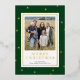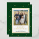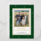 Celebrar el destello de Navidades elegantes con el envío de la tarjeta fotográfica de Navidad verde y Relieve metalizado dorado moderno esta temporada navideña. La tarjeta única de vacaciones fotográficas cuenta con un rico fondo verde oscuro, hermosos puntos de Relieve metalizado dorado y un oro de lujo Feliz Navidad para hacer su brillo de saludo. Su foto está enmarcada con gusto en un rectángulo blanco opuesto, bordeado por un trazo de Relieve metalizado dorado. La parte trasera de la tarjeta termina con el aspecto clásico con el rico fondo verde oscuro. Una tarjeta perfecta para los amantes del minimalismo combinado con un toque de lujo.