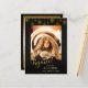 Elegantes y festivos chispas doradas y copos de nieve en el fondo negro con caligrafía "Regocijo" gráfico de texto y tres líneas de texto editable con un lugar para tu foto de vacaciones. Patrón complementario de copo de nieve en la parte posterior con campos de texto para su dirección y saludo.